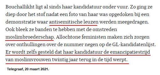 Bij de verkiezingen in maart 2021 heeft GroenLinks-kandidaat Kauthar Bouchallikht met voorkeurstemmen een zetel bemachtigd in de Tweede Kamer. Zij raakte eerder in opspraak vanwege haar bestuursfunctie bij Femyso, een islamitische koepelorganisatie die volgens experts gelieerd is aan de Moslimbroederschap die streeft naar een islamitische samenleving en invoering van de sharia in Europa. Ook bleek zij een training te hebben verzorgd bij de Turks-nationalistische organisatie Milli Görüs, waar mannen en vrouwen gescheiden moesten zitten en volgde Kauthar mediatrainingen bij de aan de Moslimbroeders verbonden Turkse Sinan Wren Foundation. In 2016 als cursist en in 2019, een jaar voordat ze op de kieslijst van GroenLinks verscheen, als medeorganisator. In juli 2020 deed zij mee aan een demonstratie tegen Israël waar spandoeken met hakenkruizen waren te zien.
