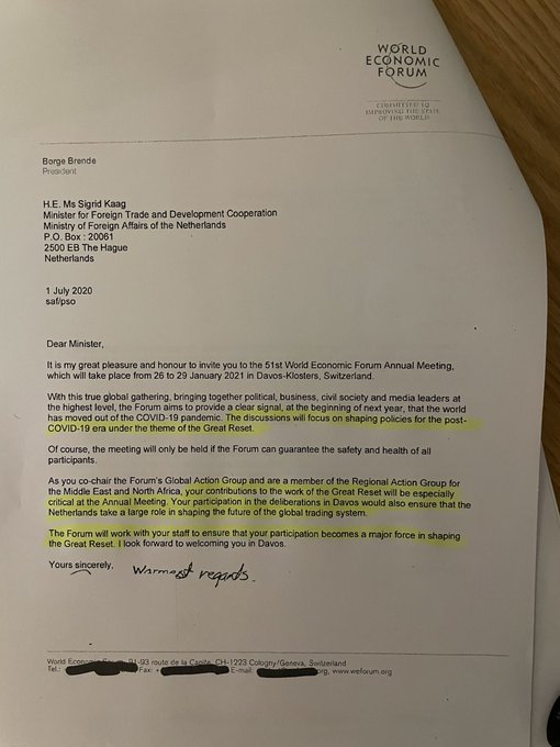 Houwelingen: Uit de vrijdag op verzoek verzoeken WEF-papieren. Een brief van deze particuliere organisatie gericht aan minister Sigrid Kaag. Citaat: “Het Forum zal er samen met je medewerkers voor zorgen dat jouw deelname een belangrijke kracht wordt bij het vormgeven van de Grote Reset.”