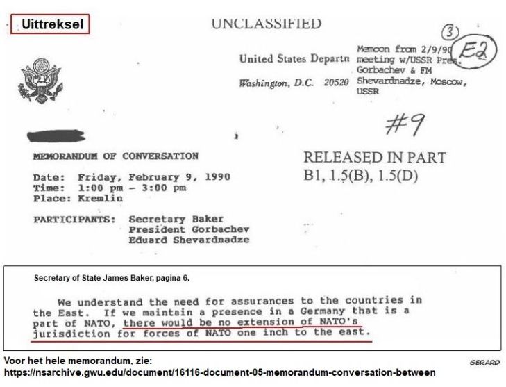 Tijdens de onderhandelingen over de eenwording van West-Duitsland en de DDR heeft de Amerikaanse minister van Buitenlandse Zaken James Baker op 9 februari 1990 aan Sovjetleider Michail Gorbatsjov de garantie gegeven dat de NAVO haar operatiegebied geen ‘inch’ naar het oosten zou gaan uitbreiden. Hieronder de toezegging. Het hele memorandum uit het Amerikaanse archief is overigens hier te lezen.