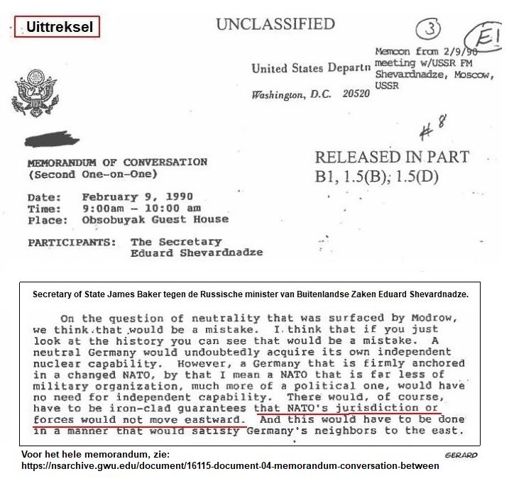Eerder die dag had Baker ook al al de garantie gegeven aan de Russische minister van Buitenlandse Zaken Eduard Shevardnadze om de NAVO niet oostwaarts te gaan uitbreiden. Klik hier voor het hele memorandum.